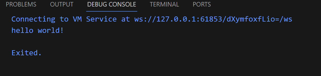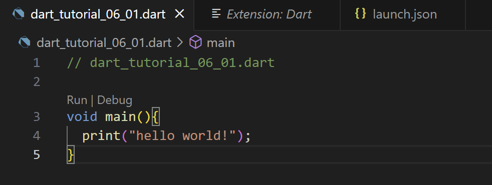 1. void main() ํจ์ ๋ด๋ถ์ print("hello world!"); ๋ฅผ ์ ๋ ฅํ๊ณ Debug or Run.
