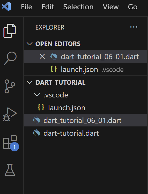 1) DART-TUTORIAL์ด๋ผ๋ ์๋ก์ด ํด๋๋ฅผ ์์ฑํ๊ณ , ์์ ์ ์ํ ์๋ก์ด ํ์ผ(dart_tutorial_06_01.dart)์ ํ๋ ์์ฑํ๋ค.