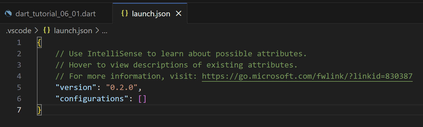 dart_tutorial_06_01.dart ํ๋ก๊ทธ๋จ์ ์คํํ๋ฉด, ๊ทธ๋ฆผ2)์ ๊ฐ์ ๋ด์ฉ์ด ๋ด๊ธด ํญ ({ } launch.json : ms code๊ฐ ๊ด๋ฆฌํ๋ ์คํํ๊ฒฝ) ์ด ์ด๋ฆฌ๋๋ฐ, ์ด๋ ์ด json ํ์ผ ๋ด๋ถ์ ์ถ๊ฐ์ ์ผ๋ก ์ ๋ ฅํ ์ฌํญ๋ค์ด ๋ช ๊ฐ์ง ์๋ค.