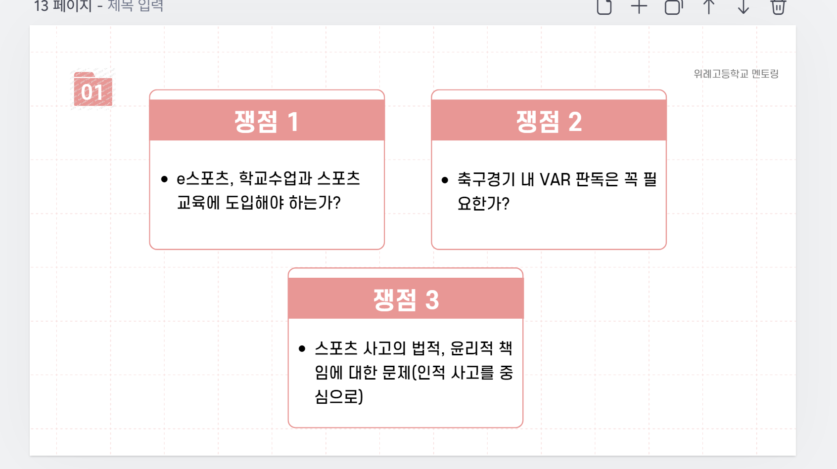 필자가 준비한 주제는 총 3가지였다. 크게 쟁점으로 구분을 하는데, 선정 기준은 다음과 같았다. 1) 최근 가장 핫한 이슈, 2) 고등학생들이 좋아할 만한 스포츠, 3) 스포츠를 경험하면서 겪을 수 있는 사회적 문제다.