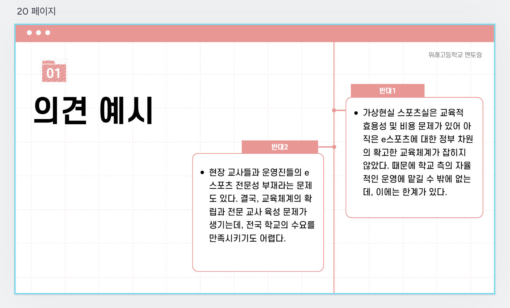 각 쟁점마다 아래 예시와 같이 간단하게 생각할 수 있는 찬/반 의견을 언급해주고, 학생들을 조별로 편성해서 토의를 진행했다.