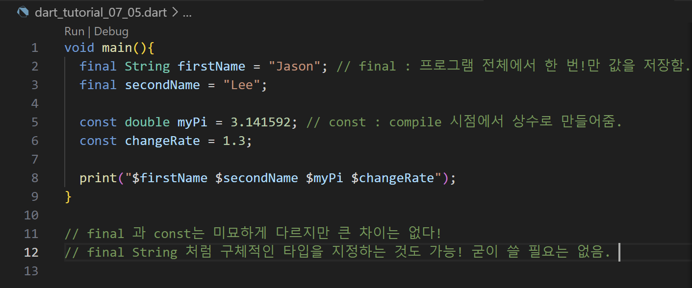 2๋ฒ ์งธ ์ค์ฒ๋ผ ๊ตฌ์ฒด์ ์ธ type์ ์ง์ ํด์ฃผ๋ ๊ฒ๋ ๊ฐ๋ฅํ์ง๋ง, const, final๋ง ์จ๋ ๋ฌด๋ฐฉํ๋ค.