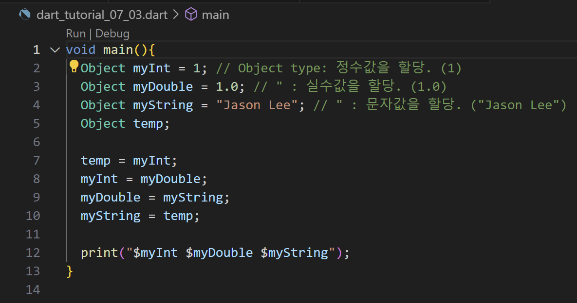 // -> dynamic type๋ ๋์ผํ๊ฒ ์ฌ์ฉํ๋ค.