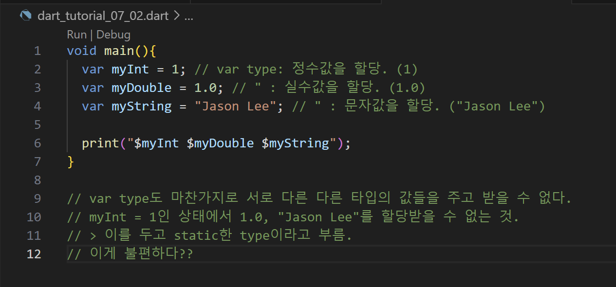 2๋ฒ ์งธ ์ค์ฒ๋ผ ๊ตฌ์ฒด์ ์ธ type์ ์ง์ ํด์ฃผ๋ ๊ฒ๋ ๊ฐ๋ฅํ์ง๋ง, const, final๋ง ์จ๋ ๋ฌด๋ฐฉํ๋ค.