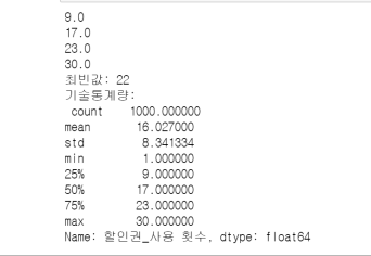 > 할인권 사용횟수의 평균은 약 16회, 표준편차는 약 8.3회 정도.