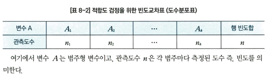 적합도 검정은 카이제곱 통계량을 사용하므로 빈도교차표에 의한 비율검정을 기반으로 한다. 적합도 검정에서는 검정의 대상이 되는 한 가지 명목 변수로 구성된 빈도교차표를 하는데, 적합도 검정에서의 빈도교차표는 1개의 범주형 변수만 사용되므로 일반적인 도수분포표와 같다.