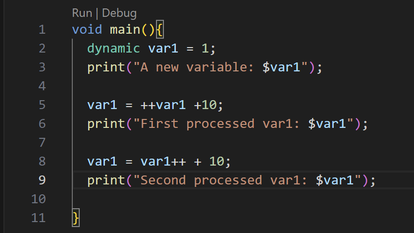 > ๋ฐ๋ก type์ ์ง์ ํด์ฃผ์ง ์์๋ ์์ ์ฒซ ๋ฒ์งธ ๊ณ์ฐ ๊ฒฐ๊ณผ์ ๋ค๋ฅด์ง ์์ ๊ฒฐ๊ณผ๊ฐ ๋์ค๋ ๊ฒ์ ์ ์ ์๋ค. ์ฌ๊ธฐ์ Dart๊ฐ ๊ฐ๋ ํน์ดํ ์ฐ์ฐ์๊ฐ ์๋๋ฐ, ๋ฐ๋ก '++' ์ฐ์ฐ์์ด๋ค! ์ฝ๋๋ฅผ ํตํด ์ด๋ป๊ฒ ์ฌ์ฉํ๋์ง ํ ๋ฒ ์์๋ณด์.