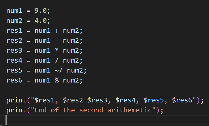 > ์์๋๋ก ๋ํ๊ธฐ(+), ๋นผ๊ธฐ(-), ๊ณฑํ๊ธฐ(*), ๋๋๊ธฐ(/), ๋ชซ(~/), ๋๋จธ์ง(%) ๋ฅผ ์๋ฏธํ๋ค.