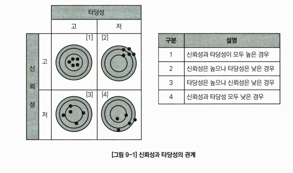 - 체계적 오차: 측정과정에서 일정한 패턴을 나타내는 오차를 의미, 타당성을 결정하는 개념이다. 체계적 오차는 총기 자체의 품질을 의미한다고 볼 수 있다. 즉, 총기 자체가 얼마나 정확하게 목표물을 향해 정렬되어 있느냐의 의미. 만약, 총기 자체의 가늠자 및 가늠쇠가 잘못 조정되어 있으면 아무리 명사수여도 계속 목표물에서 어긋나게 쏠 수밖에 없다. But, 지속적으로 일정한 목표물을 향해 겨냥하므로 중앙에서 벗어나지만 매번 같은 곳을 맞춘다.