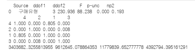 df1['구매유형'].astype(str)print(scikit_posthoc_scheffe(df1, val_col = '총_매출액', group_col = '구매유형'))print(구매유형[0].mean(), 구매유형[1].mean(), 구매유형[2].mean(), 구매유형[3].mean())