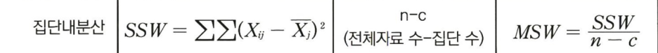- 집단 내 분산: ssw(sum of square within groups)라고 하며, 각 집단의 평균치를 중심으로 각 집단 내의 자료들이 우연적 오차에 의해 어떻게 흩어져 있는지를 요약하는 척도.
