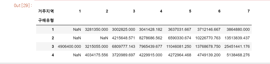 구매유형, 거주지역별 평균 총 매출액이 테이블 형태로 출력된 모습)