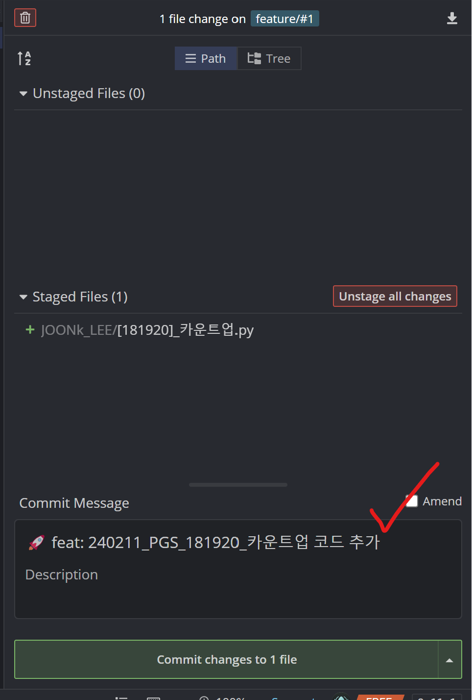 > ์ด๋ GUI๋ฅผ ๋ณด๋ฉด, Unstaged๋ ํ์ผ์ ๋๊ณ ์์ง add๋๊ธฐ ์ง์ ์ ๋๊ธฐ์ํ๊ฐ ๋๋ค. ์ด ๋ณ๊ฒฝ์ฌํญ์ ์ด์ stage ํ๋ฉด, feature ๋ธ๋์น๋ก ์์ ํ ์ฝ๋๊ฐ 'Add'๋๊ณ , ๋ด ์๊ฒฉ ์ ์ฅ์๋ก commit๋๊ธฐ ์ง์ ์ ์ํ(Staged files)๋ก ๋ฐ๋๋ค.