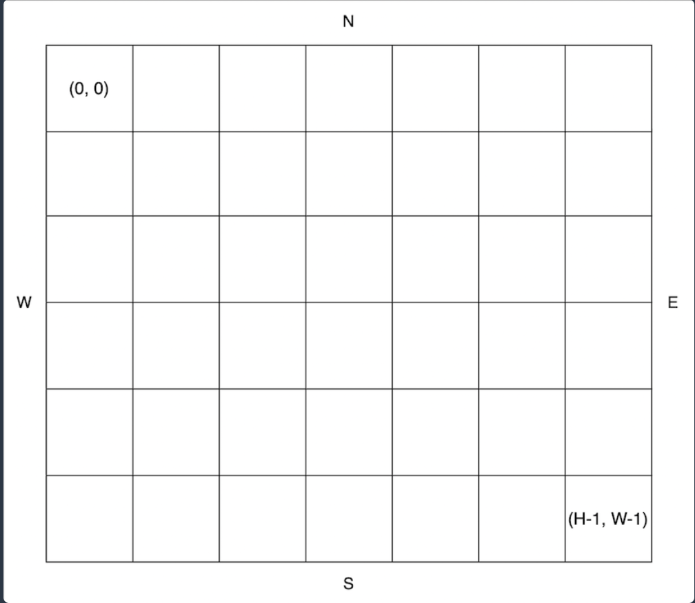 ๊ณต์์ ๊ฐ๋ก ๊ธธ์ด๊ฐ W, ์ธ๋ก ๊ธธ์ด๊ฐ H๋ผ๊ณ ํ ๋, ๊ณต์์ ์ข์ธก ์๋จ์ ์ขํ๋ (0, 0), ์ฐ์ธก ํ๋จ์ ์ขํ๋ (H - 1, W - 1) ์