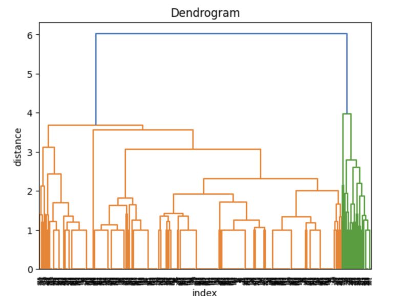 가지의 길이(distance)는 군집이 서로 얼마나 멀리 떨어져 있는지를 보여준다. 따라서 가지의 길이를 바탕으로 적절한 군집의 개수를 정할 수 있다. 위 덴드로그램에서는 2개 군집으로 나뉘어졌을 때 가장 길게 나타나므로, 최적의 군집 수는 2라고 할 수 있다!