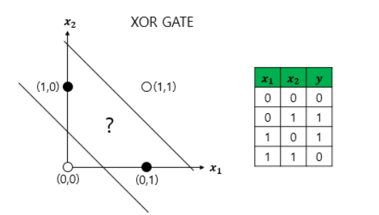 위 게이트는 모두 파이썬 코드로 간단하게 구현이 가능하다. But, 단층 퍼셉트론은 XOR 게이트의 구현이 불가능하다. XOR 게이트는 입력값 두 개가 서로 다른 값을 갖고 있을 때에만 출력값이 1이 되고, 입력값 두 개가 서로 같은 값을 가지면 출력값이 0이 되는 게이트이다. 단층 퍼셉트론은 직선 하나로 두 영역을 나눌 수 있는 문제에 대해서만 구현이 가능하다. 하지만 XOR 게이트는 직선 하나로 두 영역을 나눌 수 없다.