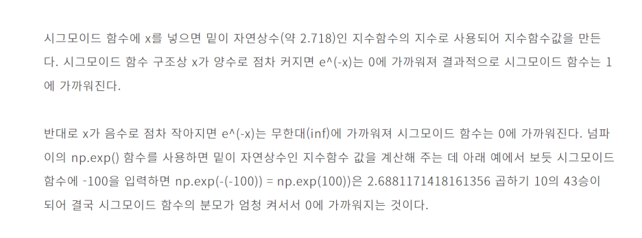 0~1 사이 값이 되어야 한다. z가 무한정 커질 수는 없기 때문에, 아주 큰 음수일 때는 0으로 수렴하고, 아주 큰 양수일 때는 1로 수렴하는 방법이 바로 시그모이드 함수(로지스틱 함수)이다.