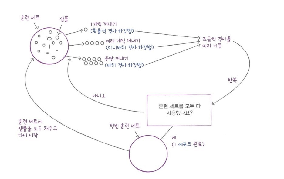 - 에포크: 확률적 경사 하강법에서 전체 샘플을 모두 사용하는 한 번의 반복 단위 수(?). 일반적으로 경사 하강법을 사용하는 알고리즘에서는 에포크를 수백 번 이상 반복한다.