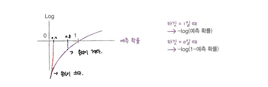 > 양성 클래스(타깃 = 1)일 때, 손실은 -log (예측 확률)로 계산한다. 때문에, 확률이 1에서 멀어질 수록, 손실은 아주 큰 양수가 된다. 음성 클래스(타깃 = 0)일 때, 손실은 -log (1- 예측 확률)로 계산한다. 이 예측 확률이 0에서 멀어질수록 손실은 아주 큰 양수가 된다.