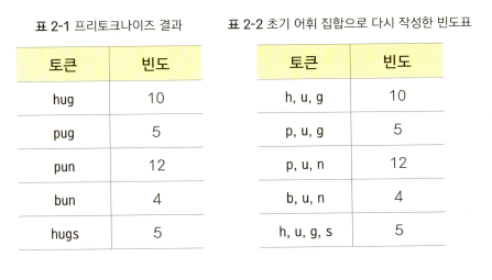 → 자주 등장하는 문자열을 병합하고 이를 어휘 집합에 추가함. 원하는 어휘 집합 크기가 될 때까지 반복.