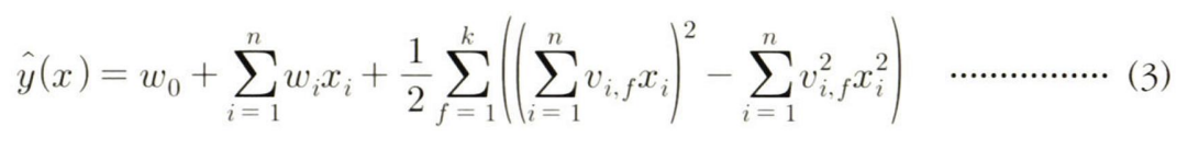 입력 변수 x 의 모든 가능한 2개 씩의 조합에 대해 해당 x의 잠재요인행렬 v의 값을 내적하고, 여기에 x의 값을 곱한다. v 는 MF의 P 혹은 Q 행렬처럼 각 변수를 k개의 특성값(feature value)으로 표현하는 잠재요인행렬로 생각한다.