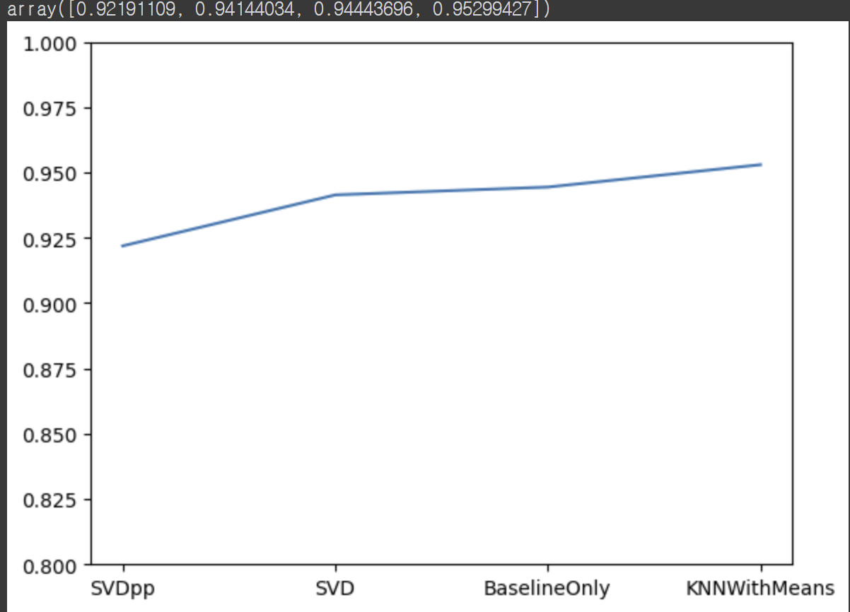 ➡️ SVDpp 가 RMSE = 0.9219 정도로 가장 정확하고, KNNWithMeans가 RMSE = 0.95299 정도로 정확도가 가장 낮다.