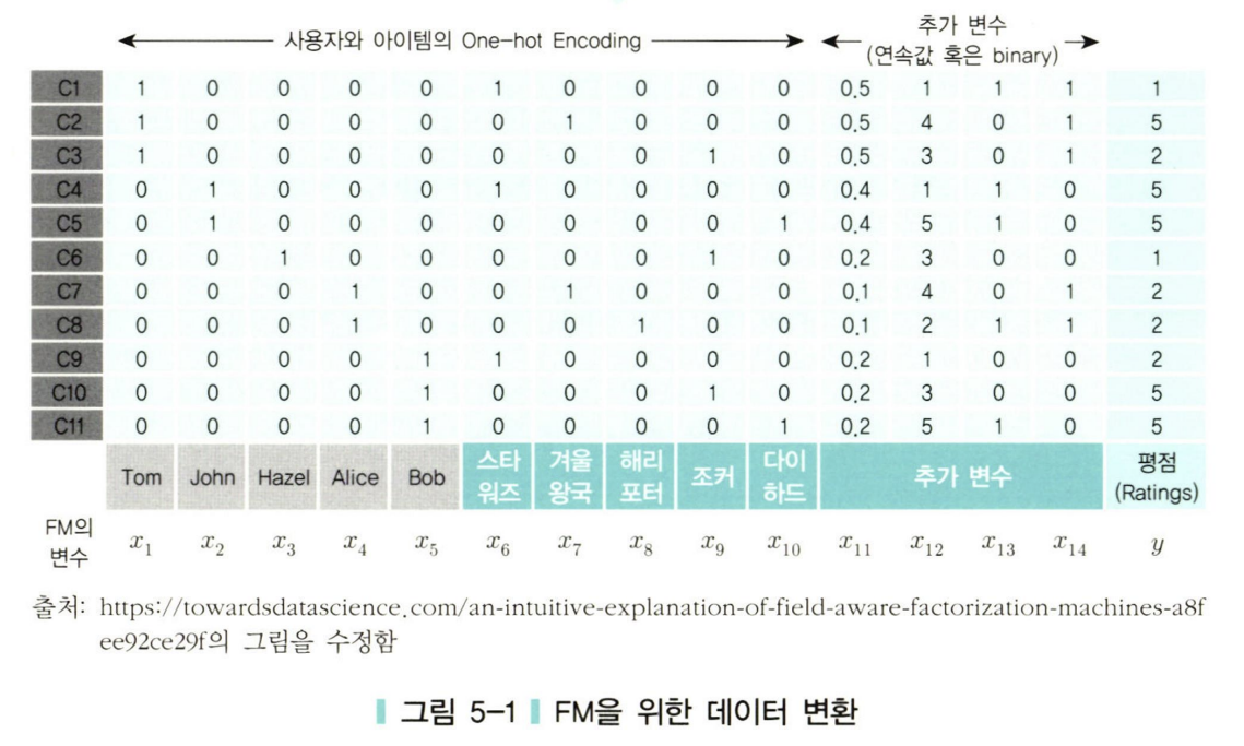 cc FM에서는 유저와 아이템 Encoding 외에 다른 정보가 포함될 수 있다고 했다. '추가 변수' 열이 이들 변수를 나타낸다. FM은 MF 와 다르게 유저, 아이템 변수 외에 추가적인 변수를 사용할 수 있다는 점에서 더 일반화된 모형이라고 할 수 있다.