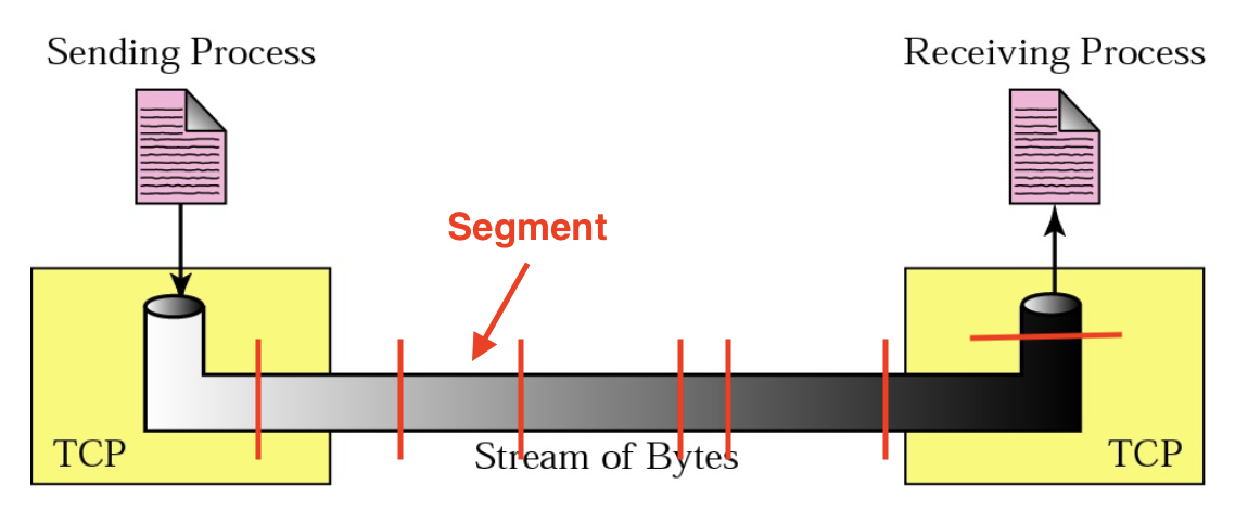 4๊ณ์ธต(Tranport Layer)์์๋ ์์ 1, 2, 3 ๊ณ์ธต์์ ์ก์๋ด์ง ๋ชปํ ์๋ฌ๋ฅผ ๊ฒ์ถํ๊ณ ๋ณต๊ตฌํ๋ ์ญํ ์ ํ๋ค. ์ด ๋ TCP ๋ ์ ๋ณด๋ฅผ ์ฃผ๊ณ ๋ฐ๋ ๊ณผ์ ์์ ์ฌ์ฉ๋๋ ํต์ ํ๋กํ ์ฝ๋ก, ํต์ ๋ฉ์์ง๋ก ๋ถ๋ฆฌ๋ ์ ๋ณด๋ก ์ก์์ ํ์ง ์๋๋ค. ๋์ byte๋ฅผ packet ํํ๋ก ๋ชจ์ Segment๋ผ๋ ๋จ์๋ก ์ ๋ณด๋ฅผ ์ฃผ๊ณ ๋ฐ๋๋ค.