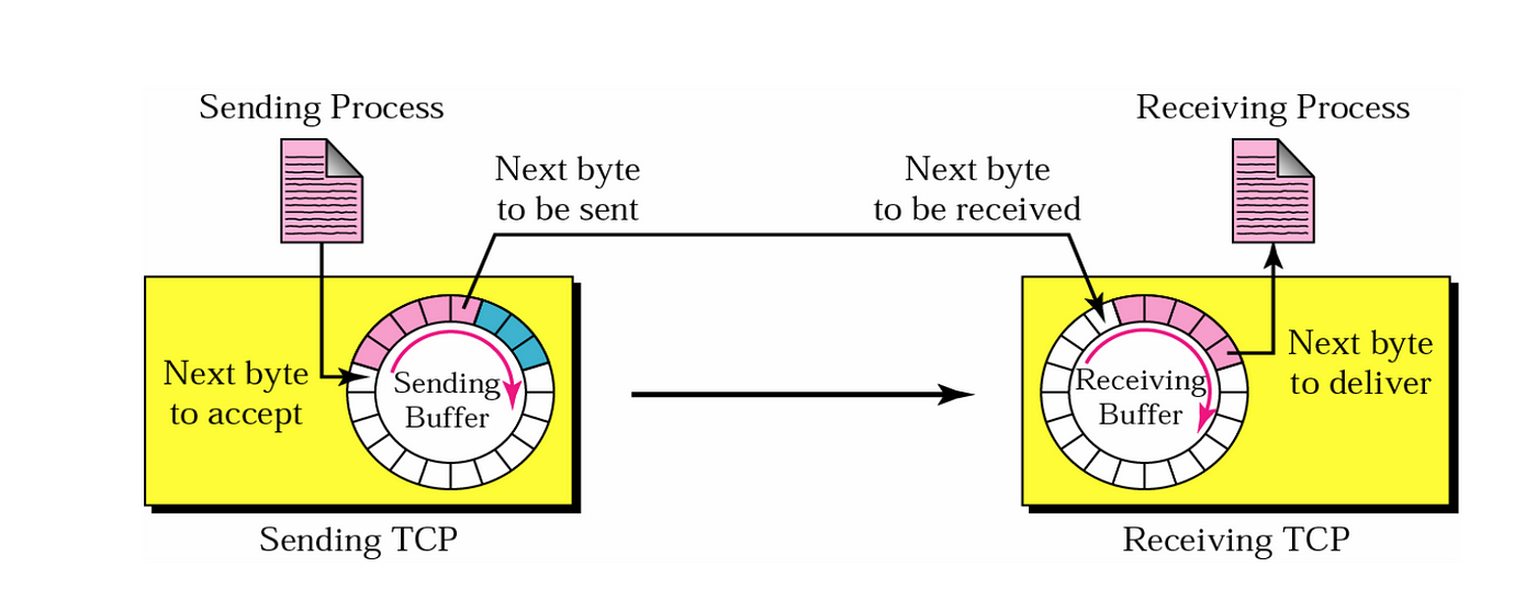 ์์ ๊ณผ ์ก์ ๊ณผ์ ์์ ์ ๋ณด๋ ํญ์ ๊ฐ์ ์๋๋ก ๊ฐ์ง ์๋๋ค. ๊ทธ๋์ TCP๋ ์ ๋ณด์ ์์ ์ ์ฅ์ ์ํ ๊ณต๊ฐ์ธ ๋ฒํผ๋ฅผ ํ์๋ก ํ๋ค. ์ด ๋ฒํผ์ ํ ๊ฐ์ง ๋ฐฉ์์ด ์ฐ๋ฆฌ๊ฐ 'ํ'์์ ํํ ๋ณด๋ ์ํ ํ๋ค.