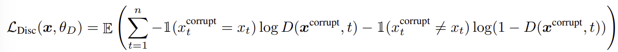 4️⃣ 치환된 입력 x 𝑐𝑜𝑟𝑟𝑢𝑝𝑡에 대해서 discriminator는 아래와 같이 각 토큰이 원래 입력과 동일한지 치환된 것인지 예측한다.
