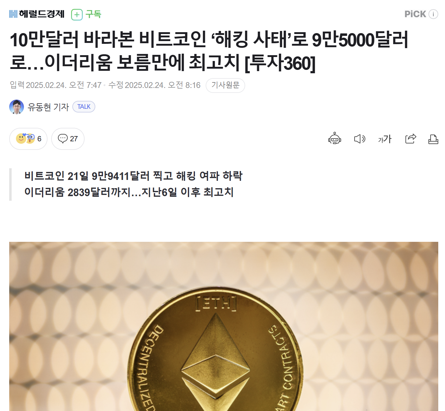 - 주요내용: 비트코인이 해킹 여파로 하락한 반면, 이더리움은 최근 최고가를 기록했다.